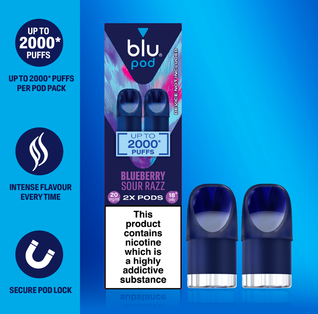 Blu Bar Blueberry Sour Raspberry: Blueberry Sour Raspberry flavoured vape pods.
